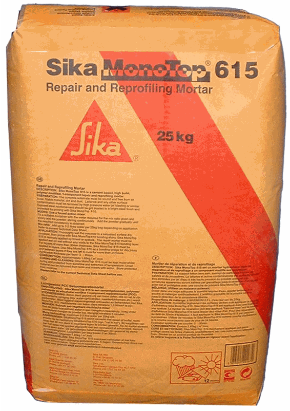 Sika MonoTop-615 HB adalah 1 komponen material repair mortar (mortar untuk perbaikan) berbahan dasar semen, modifikasi polymer dan mengandung silica fume. Sika MonoTop-G] 5 HB merupakan bagian dari Sistem MonoTop untuk perbaikan dan pelindung beton.