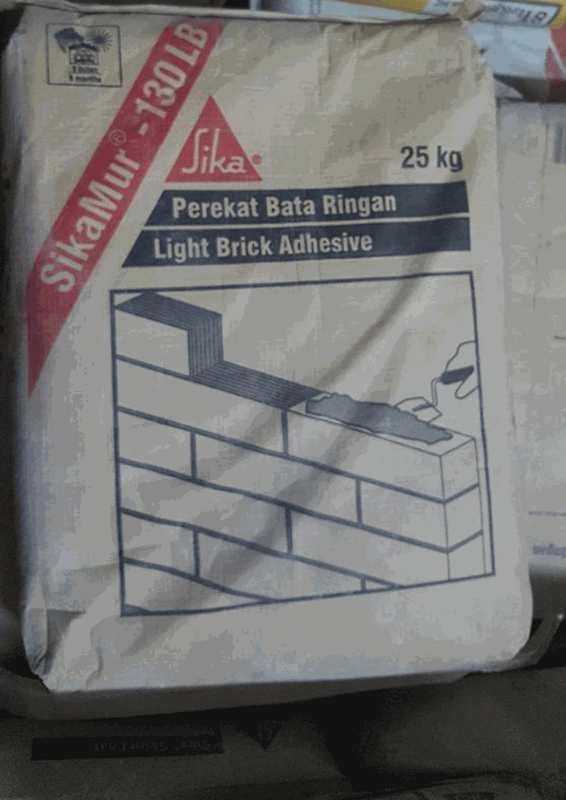 SikaMur-130 LB adalah satu komponen mortar perekat bata ringan siap pakai, berbasis polimer modifikasi, yang dikombinasikan dengan semen dan pasir bermutu dan bahan aditif, sehingga memiliki daya rekat yang kuat.